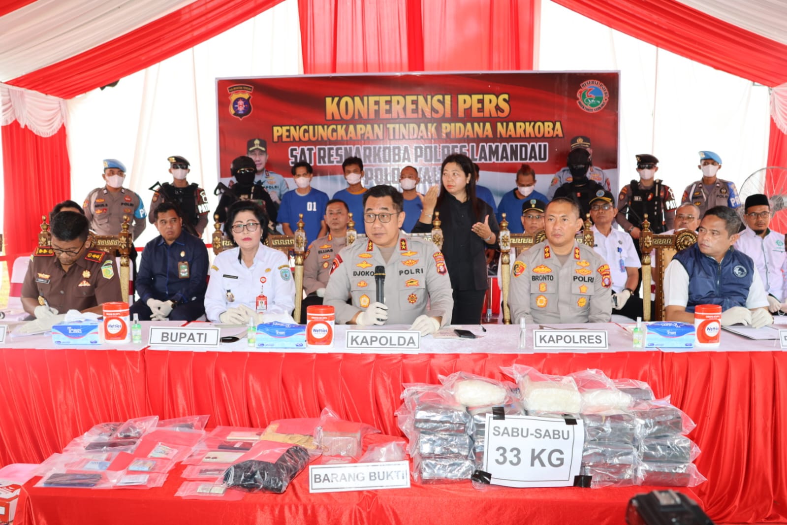 Lebih lanjut, Kapolda juga menerangkan bahwa kelima pelaku yang berhasil diamankan tersebut, diantaranya HM dan YL dengan barang bukti 33 paket platik bungkus berisi sabu dengan total berat sebanyak 33,6 Kilogram.