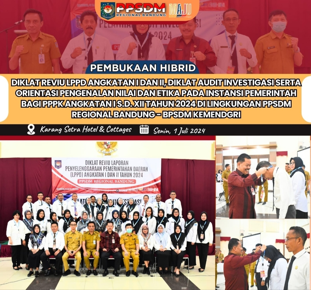 CNN–Bandung, Pusat Pengembangan Sumber Daya Manusia (PPSDM) Regional Bandung pada Badan Pengembangan Sumber Daya Manusia (BPSDM) Kementerian Dalam Negeri (Kemendagri) resmi membuka 15 program pelatihan penting pada hari ini (Senin, 01/07/2024). Program yang dilaksanakan meliputi Diklat Reviu Laporan Penyelenggaraan Pemerintahan Daerah (LPPD) Angkatan I dan II, Diklat Audit Investigasi, serta Orientasi Pengenalan Nilai dan Etika pada Instansi Pemerintah bagi Pegawai Pemerintah dengan Perjanjian Kerja (PPPK) Angkatan I hingga XII. Acara ini diadakan secara hibrid, dengan kegiatan klasikal di Karang Setra Hotel and Cottages, Bandung, dan kegiatan virtual untuk orientasi PPPK.