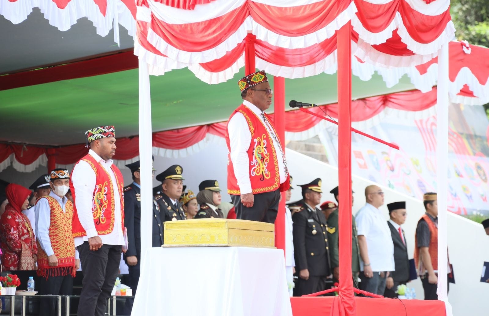 “Ketiga momentum tersebut menjadi landasan penting bagi kita dalam mewujudkan Indonesia yang lebih maju, berdaulat, dan sejahtera,” kata Wempi yang mengenakan pakaian adat suku Dayak.