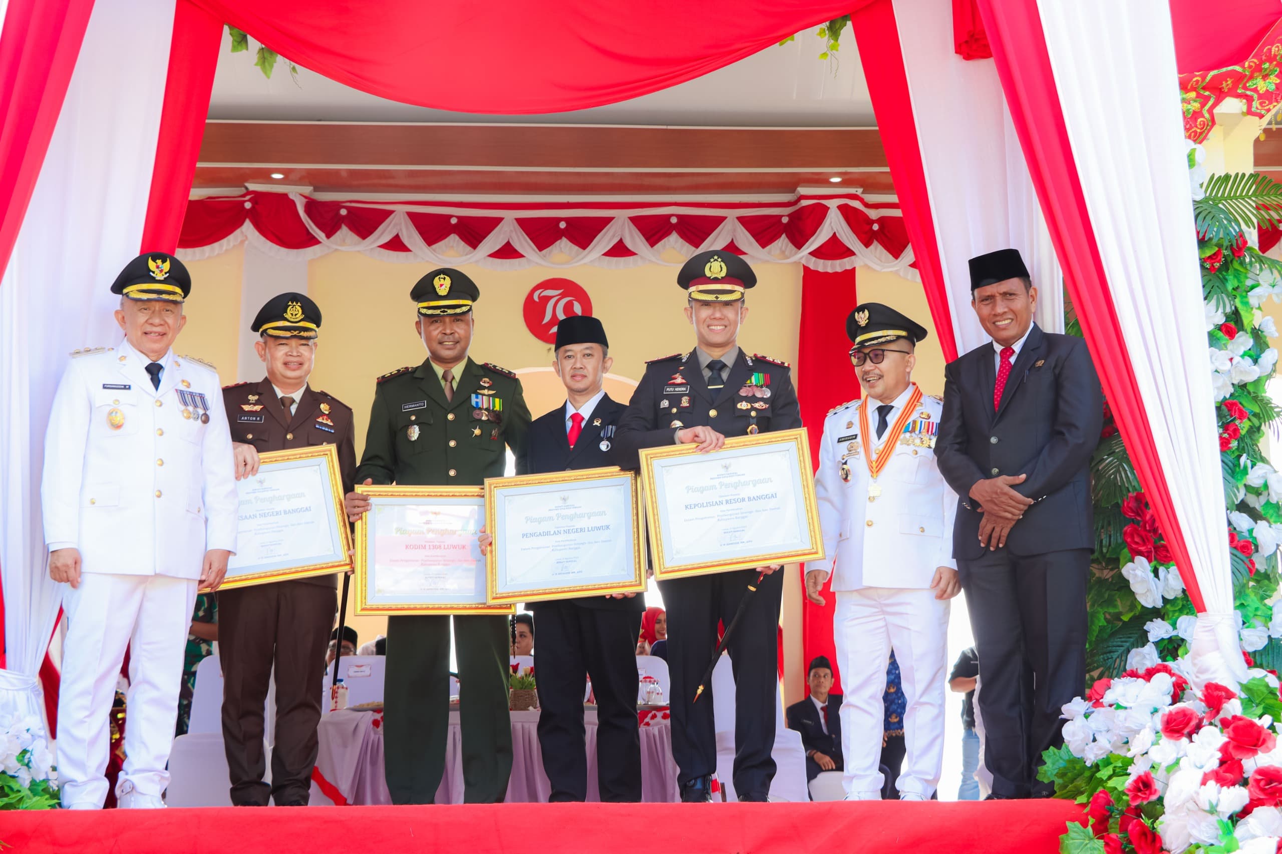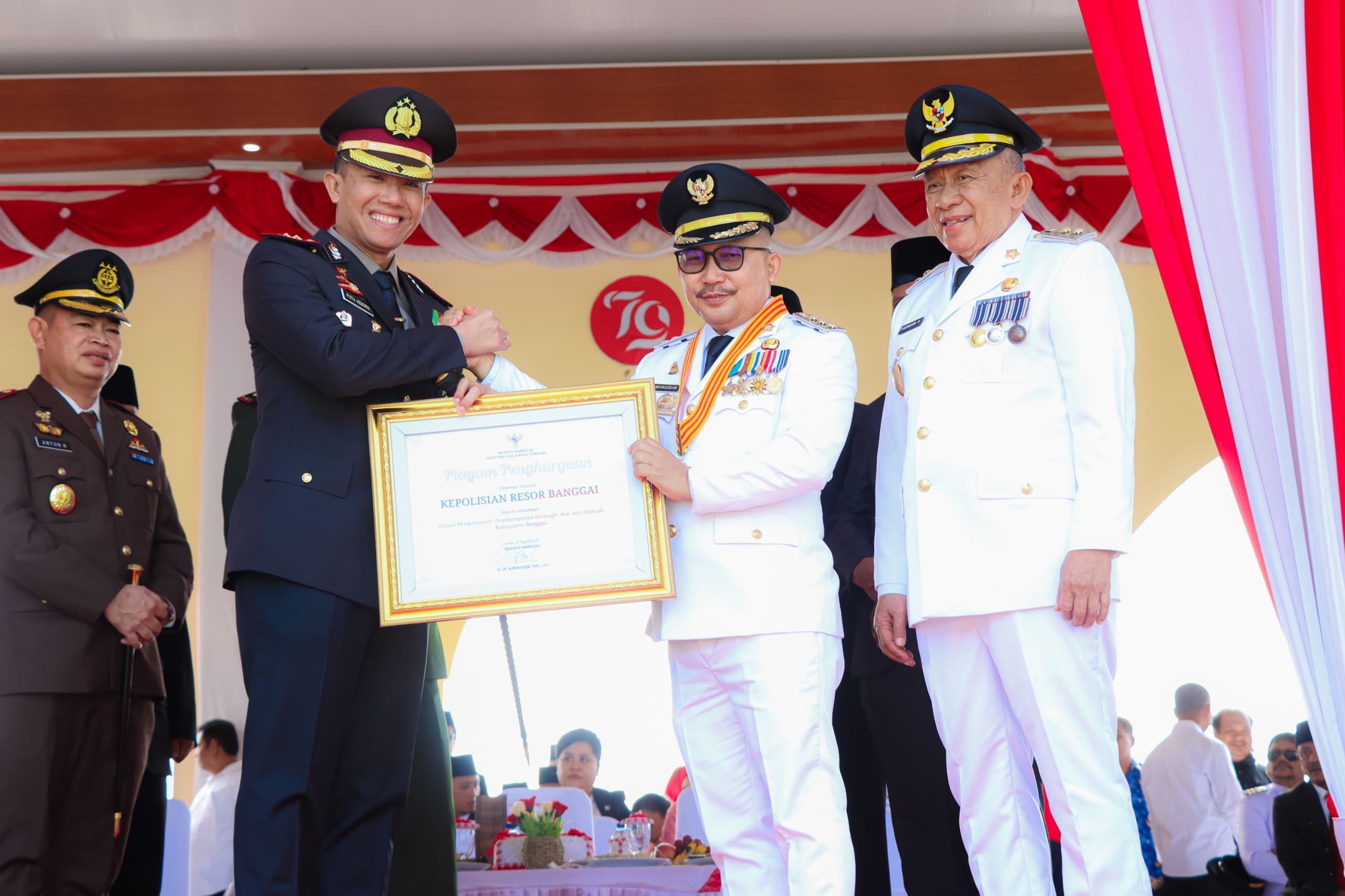 CNN–Luwuk, Kepala Kepolisian Resort (Kapolres) Banggai, Sulawesi Tengah (Sulteng) AKBP Putu Hendra Binangkari SIK, menerima piagam penghargaan dari Bupati Ir. H. Amirudin Tamoreka tepat pada Peringatan Hari Ulang Tahun (HUT) ke-79 RI, di lapangan Tribun Miqran Luwuk, Kelurahan Tombang Permai, Kecamatan Luwuk Selatan, Sabtu (17/08/2024).