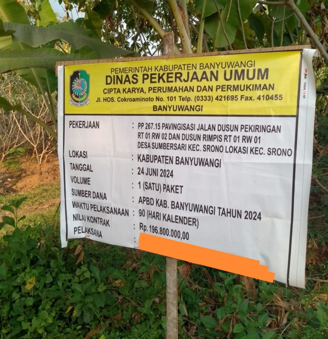 Sedangkan, lokasi proyek berada di Dusun Pekiringan Kecamatan Srono Banyuwangi, Provinsi Jawa Timur, Rabu (28/08/2024).