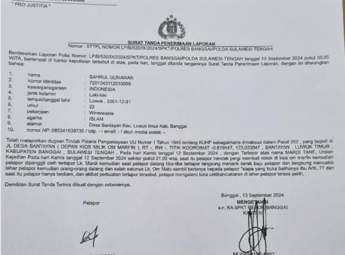 Atas kejadian tersebut, Sahrul segera melaporkan tindakan penganiyayan terhadap dirinya ke SPKT Polres Banggai, dengan Nomor STTPL LP/B/530/IX/2024. “Saya berharap, laporan ini bisa menyadarkan pendukung atau relawan bu Anti untuk tidak memaksakan kehendak mereka kepada warga lain, apalagi dengan tindakan kekerasan,” ucap Sahrul