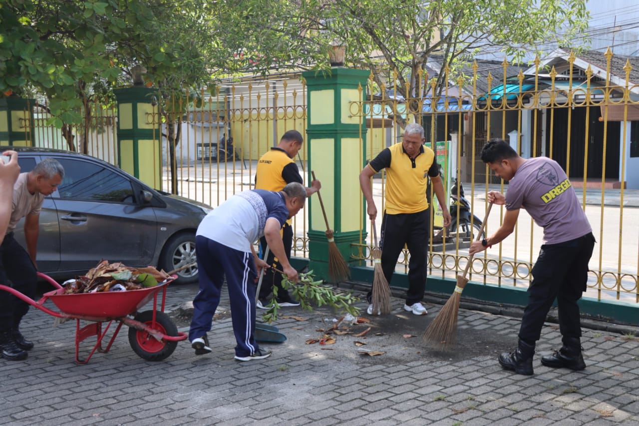 Tampak personil ada yang menyapu halaman, mencabut rumput, menyapu lantai masjid, membuang sampah, membersihkan, merapikan tanaman dan sebagainya.