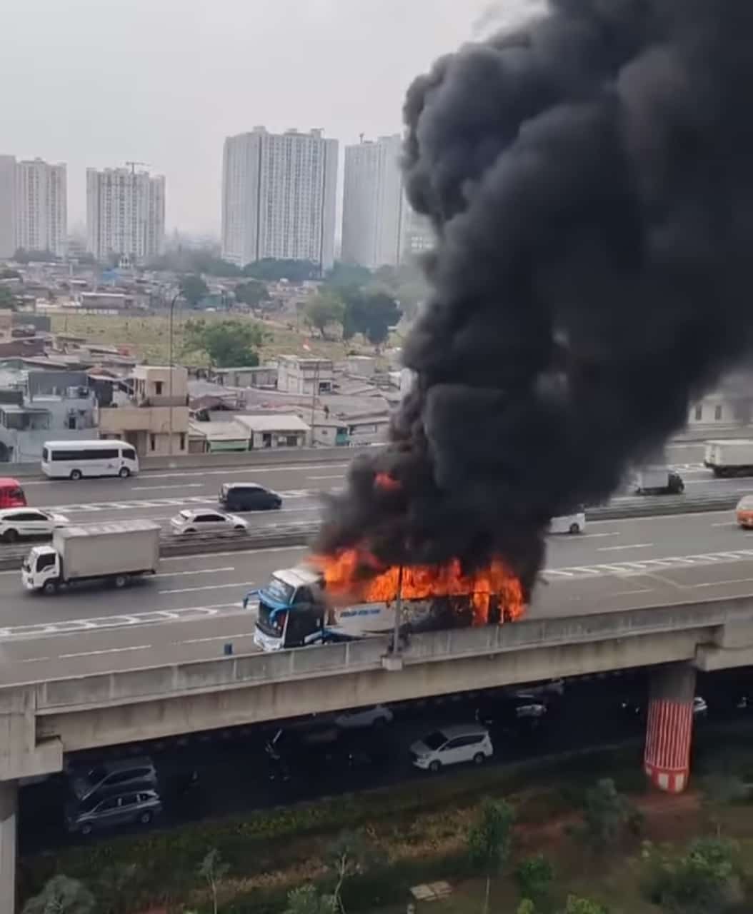 CNNJakarta, Bus pariwisata yang mengangkut 58 anak TK, terbakar di Km 03 Tol Wiyoto Wiyono, Jatinegara, Jakarta Timur. Sopir meminta puluhan anak TK tersebut turun sesaat setelah muncul api.