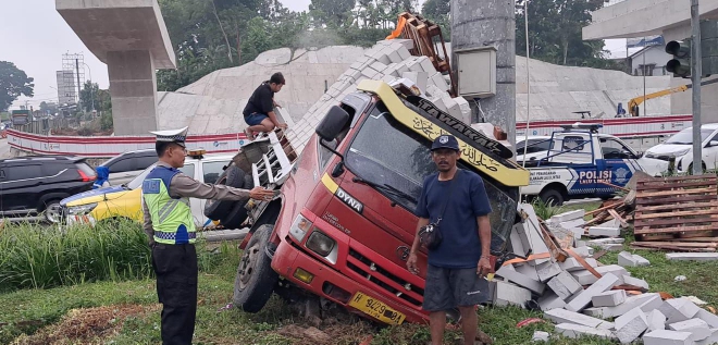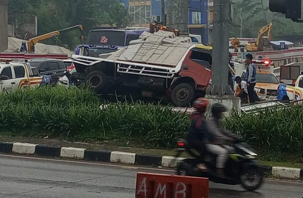 Disebabkan rem blong sebuah truk bermuatan bata ringan (Hebel) ini berhamburan keluar setelah menabrak tiang lampu penerangan jalan. Akibatnya mobil truk rengsek dan terguling namun tak ada korban jiwa.