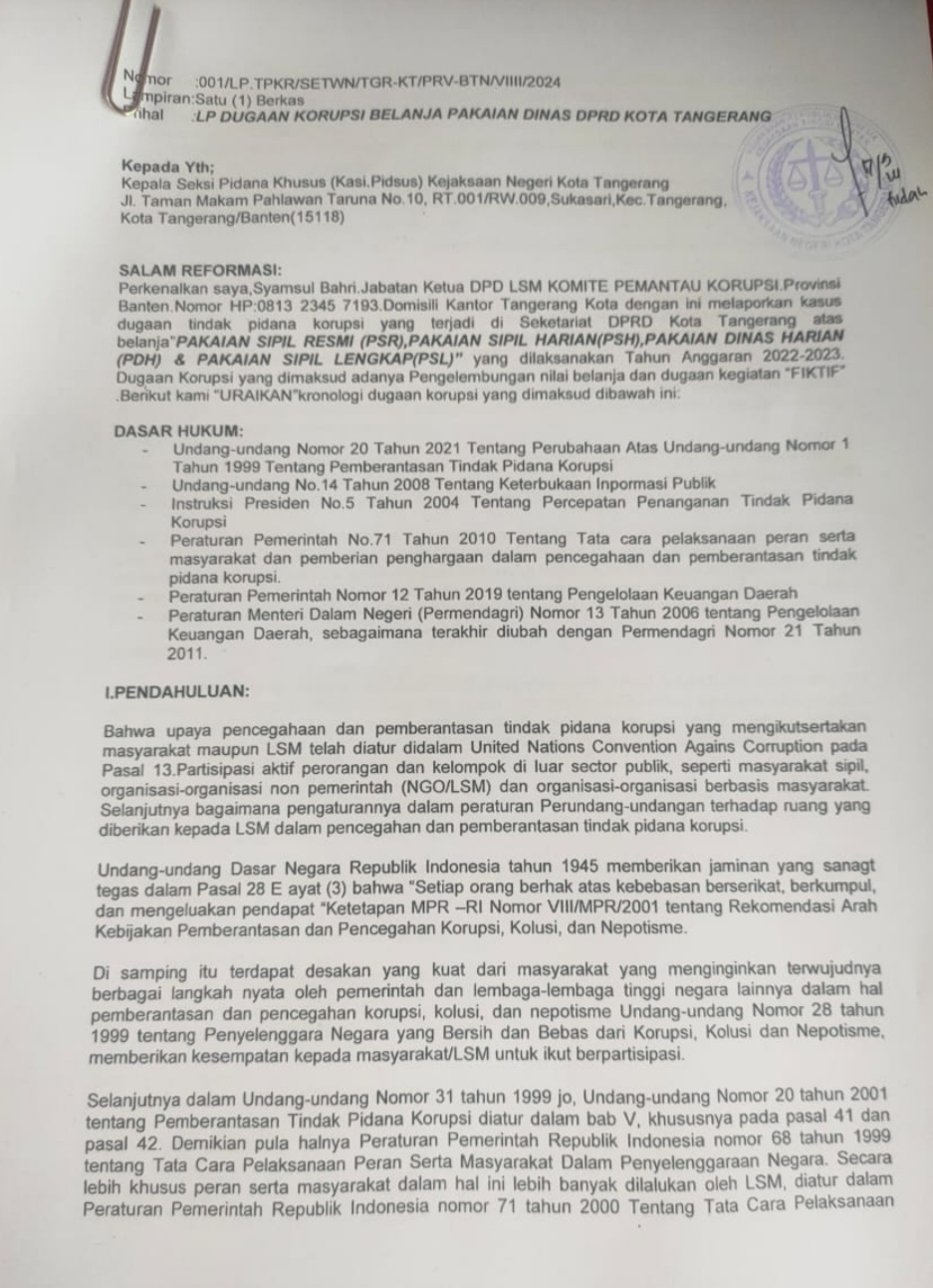 “Saya meminta dan berharap kepada pihak Kejari Kota Tangerang LP dugaan korupsi Sekretaris DPRD Kota Tangerang tanggal 17 September 2024 kemarin, segera ditindak lanjuti”, ucap Syamsul Bahri ke sejumlah Awak Media di kantornya Kota Tangerang Provinsi Banten.
