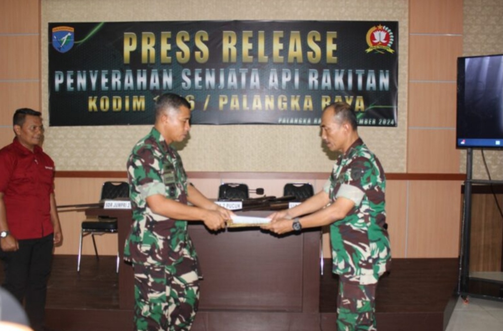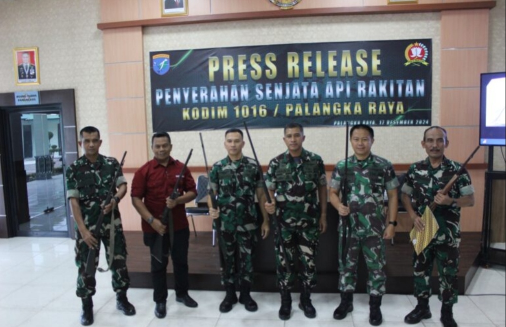 CNN-Palangka Raya, Bertempat di lobby Pamungkas Kodim 1016/ Palangka Raya Provinsi Kalimantan Tengah di laksanakan Press Release terkait penyerahan senjata api rakitan oleh masyarakat Kecamatan Manuhing dan Rungan Kabupaten Gunung Mas, Selasa 17 Desember 2024.