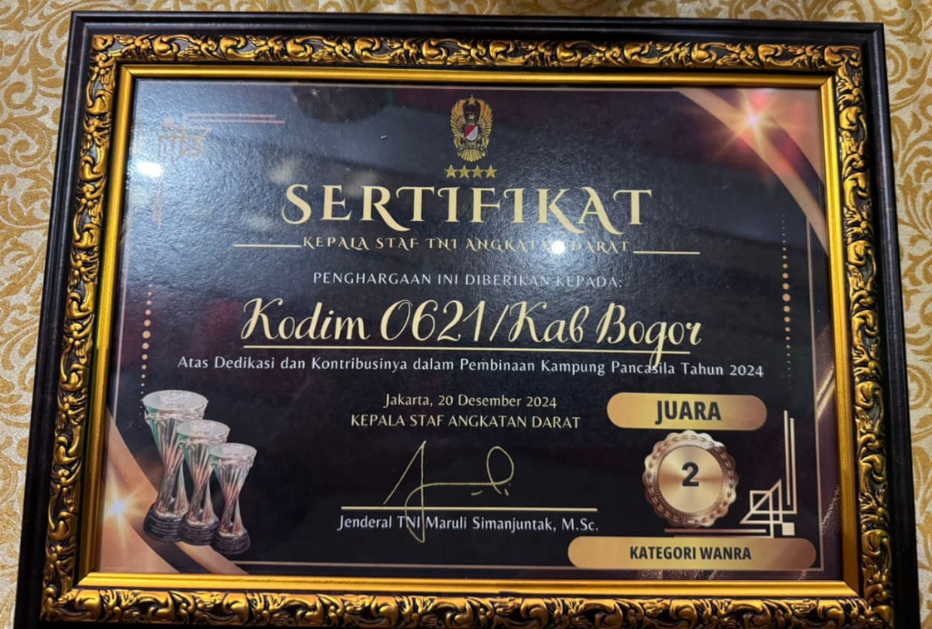 Adapun Kodim 0621 Kab Bogor,Kodam III Siliwangi salah satu yang mendapatkan penghargaan juara 2 KASAD Award Kampung Pancasila, hal itu tidak lepas dari binaan Dandim 0621 Kab Bogor Letkol Inf Anton Prasetyo, S.E., M.IP.