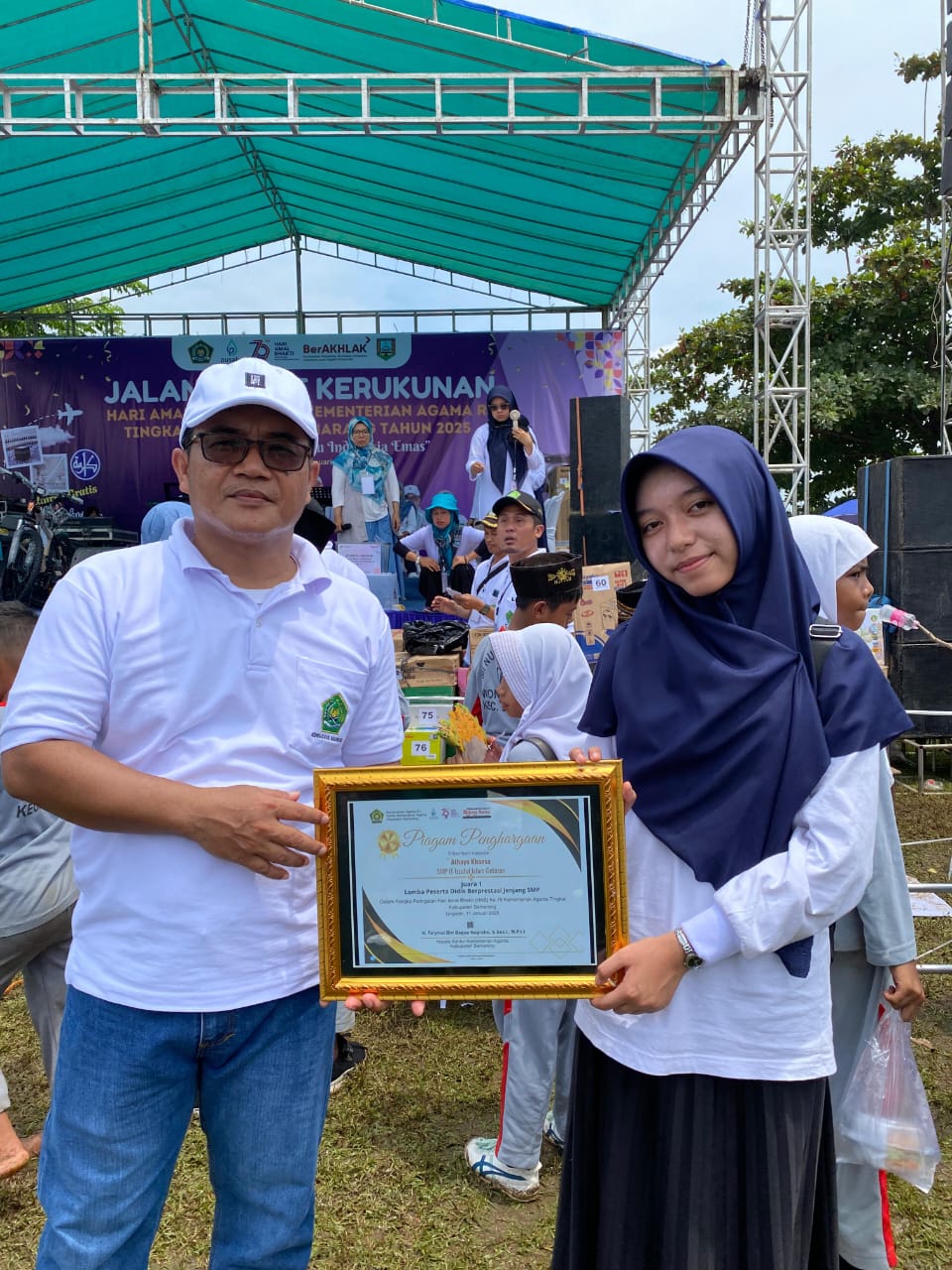 Siswa SMP IT Izzatul Islam atas nama Athaya Khansa menerima secara langsung piagam penghargaan dari Kementerian Agama Kabupaten Semarang. Penerimaan piagam digelar di Stadion NU Wonokerto, Kecamatan Bancak bersamaan dengan kegiatan Jalan Sehat Kerukunan memperingati Hari Amal Bhakti (HAB) Kementerian Agama Kabupaten Semarang.