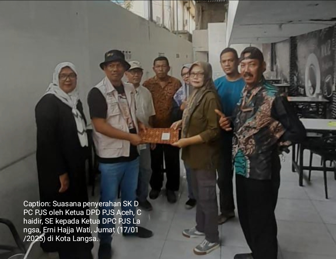 Cakrawalanational News-Langsa, Dewan Pimpinan Daerah (DPD) Pro Jurnalismedia Siber (PJS) Provinsi Aceh secara resmi menyerahkan Surat Keputusan (SK) kepengurusan Dewan Pimpinan Cabang (DPC) PJS Kota Langsa kepada Ketua DPC Langsa, Erni Hajja Wati, Jumat (17/01/2025). Penyerahan SK berlangsung di Kota Langsa dengan dihadiri jajaran pengurus DPD dan DPC PJS.
