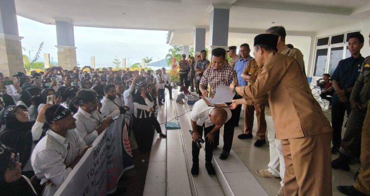 Seperti diketahui Pj. Bupati dan Ketua DPRD Banggai Kepulauan menandatangani surat kesepakatan bersama dengan nomor surat 800/21/DPRD. Yang isinya antara lain, sepakat untuk mengangkat mereka menjadi ASN PPPK penuh waktu. Pernyataan itu di sambut sorakan dan tepuk tangan bahagia dari para pendemo Aliansi Honorer Banggai Kepulauan (AHBK).