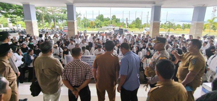 “Torang juga minta jaminan dari Pak Pj. Bupati kalau torang akan diangkat jadi PPPK penuh waktu,” tegas Hasnah Lamada dalam orasinya.