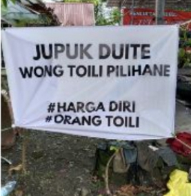 Dan Jupuk Duite Wong Toili Pilihan #Harga Diri #Orang Toili” (Bahasa Jawa).Kedua kalimat itu memiliki arti sama, yakni “Ambil uangnya pilih orang Toili”.