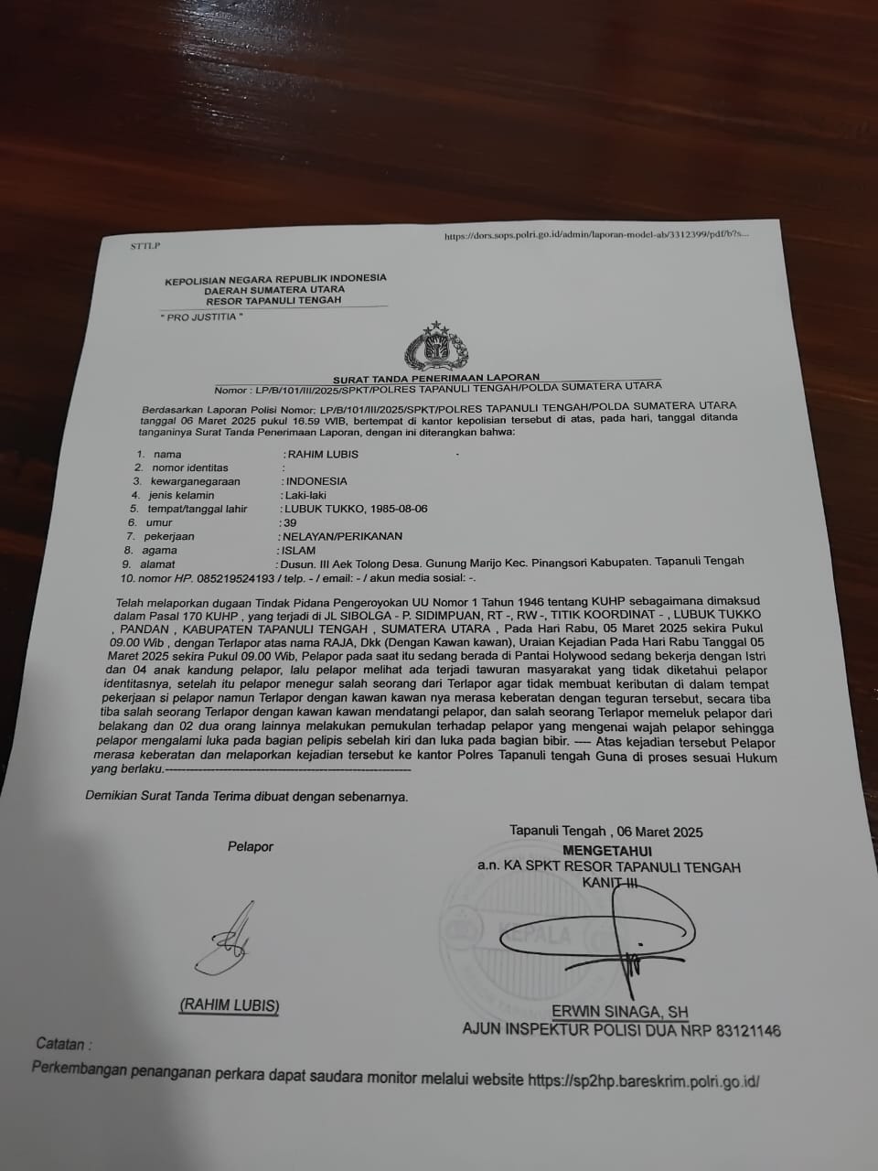 Dari hal tersebut, lalu korban bersama keluarga meminta keadilan dan melanjutkan permasalahan ini ke pihak yang berwajib pada Kamis, (6/3/2025), dan pihak kepolisian Polres Tapteng sudah mengeluarkan Surat Tanda Penerimaaan Laporan (STPL), dengan nomor:LP/B/101/III/2025/SPKT/POLRES TAPANULI TENGAH/POLDA SUMATERA UTARA.