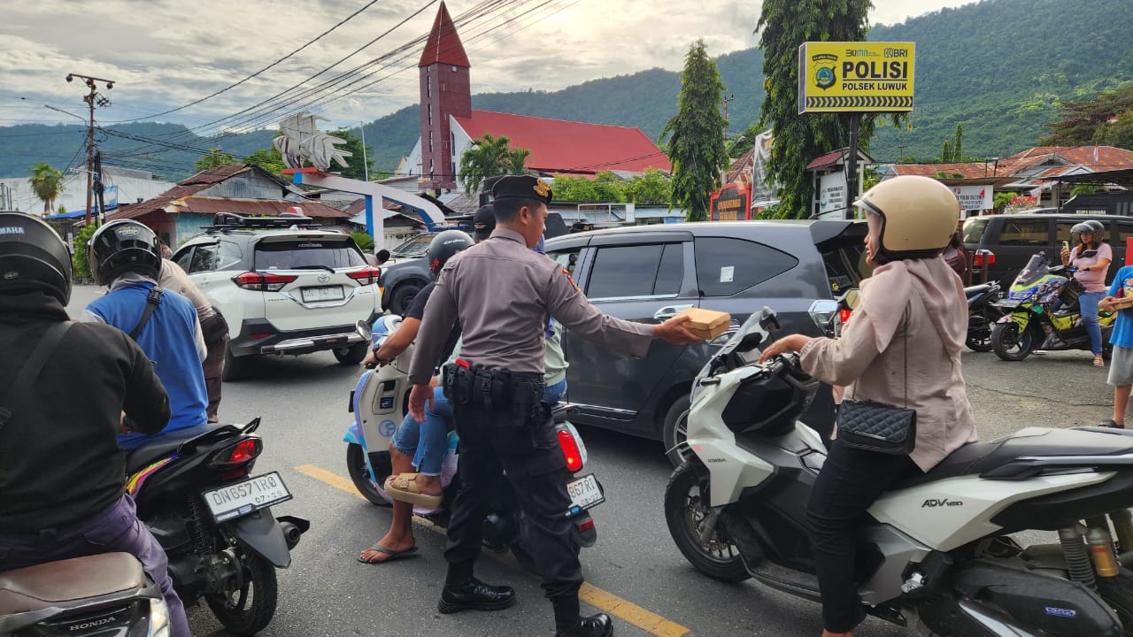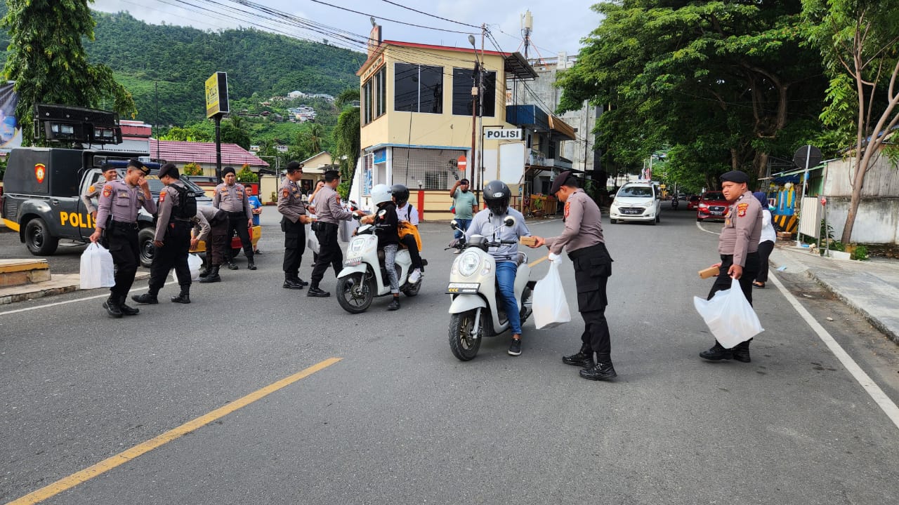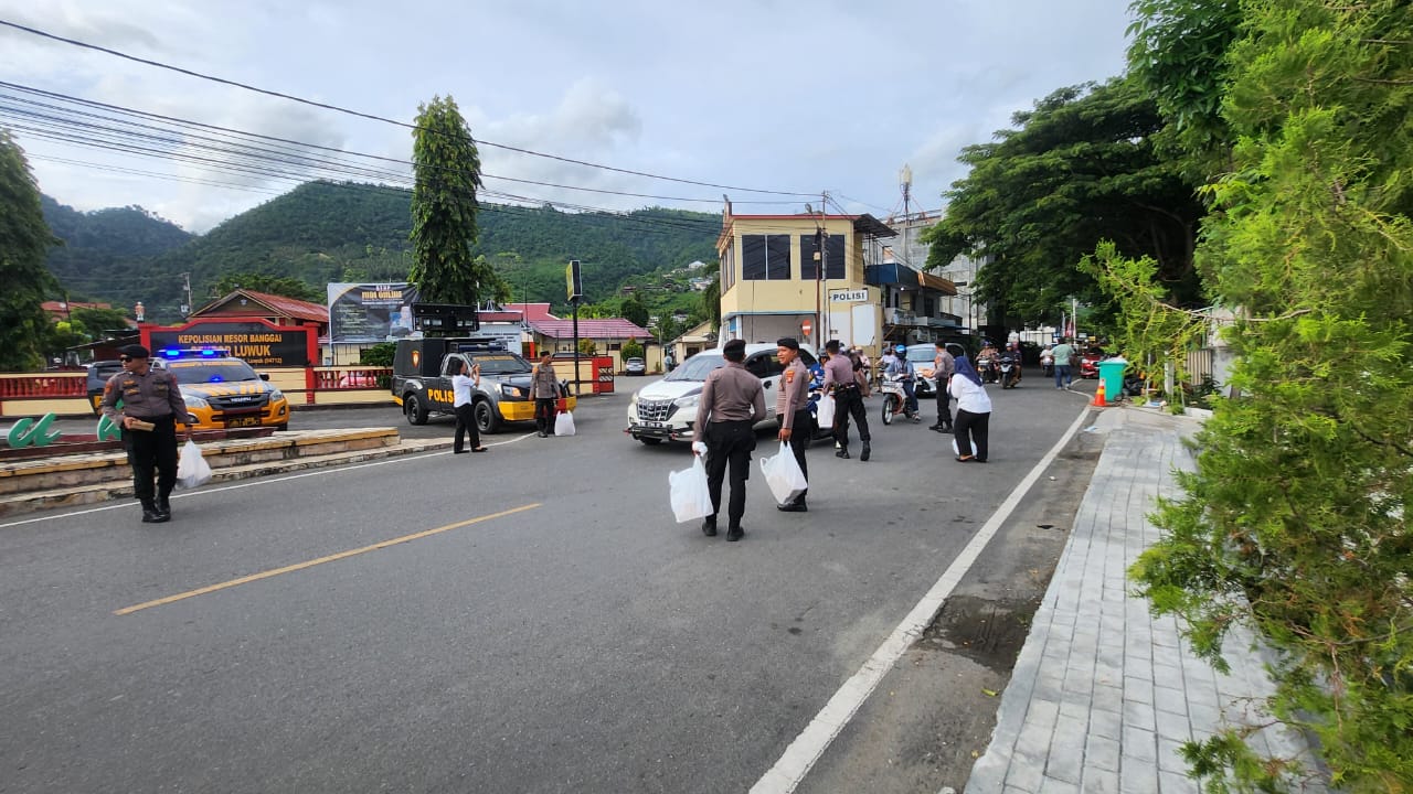 Cakrawalanational News-Luwuk, Satuan Samapta Polres Banggai menunjukkan kepeduliannya dengan membagikan takjil gratis di Jalan Samratulangi tepatnya di depan Mapolsek Luwuk menjelang berbuka puasa.