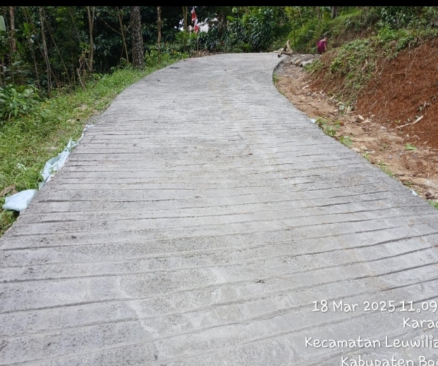 Jalan coran seluas 3.030 Meter tersebut kini membentang luas dari ujung Kampung Wanakarya menembus ke jalan utama di Desa Karacak.