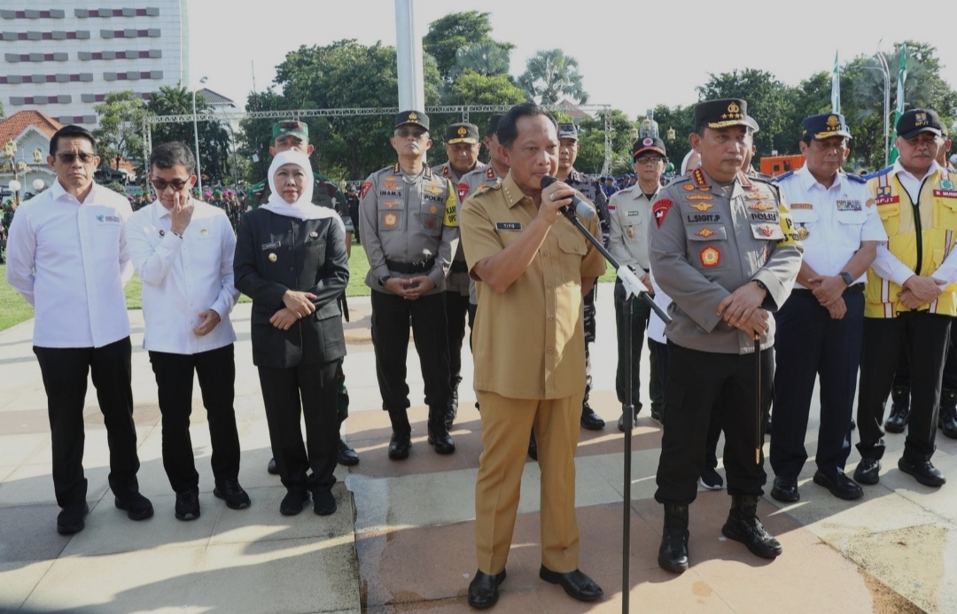 Cakrawalanational News-Surabaya, Menteri Dalam Negeri (Mendagri) Muhammad Tito Karnavian menghadiri Apel Gelar Pasukan Operasi “Ketupat-2025” dalam Rangka Pengamanan Idulfitri 1446 H di Lapangan Upacara Gedung Negara Grahadi, Surabaya, Jawa Timur, Kamis (20/3/2025). Usai apel, Mendagri menegaskan kepada awak media pentingnya peran kepala daerah dalam memastikan kelancaran arus mudik serta menjaga stabilitas harga pangan menjelang hari raya Idulfitri.