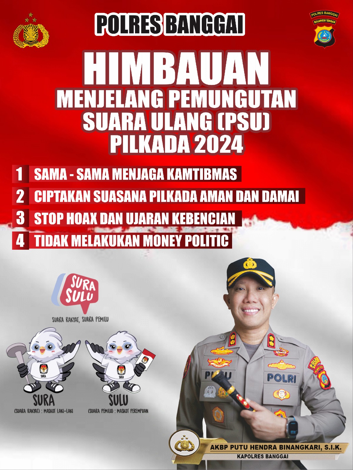 Cakrawalanational News-Luwuk, Menjelang Pemungutan Suara Ulang (PSU) Pilkada Banggai yang tinggal 4 hari, Kapolres Banggai AKBP Putu Hendra Binangkari, memberikan himbauan penting kepada seluruh elemen masyarakat.