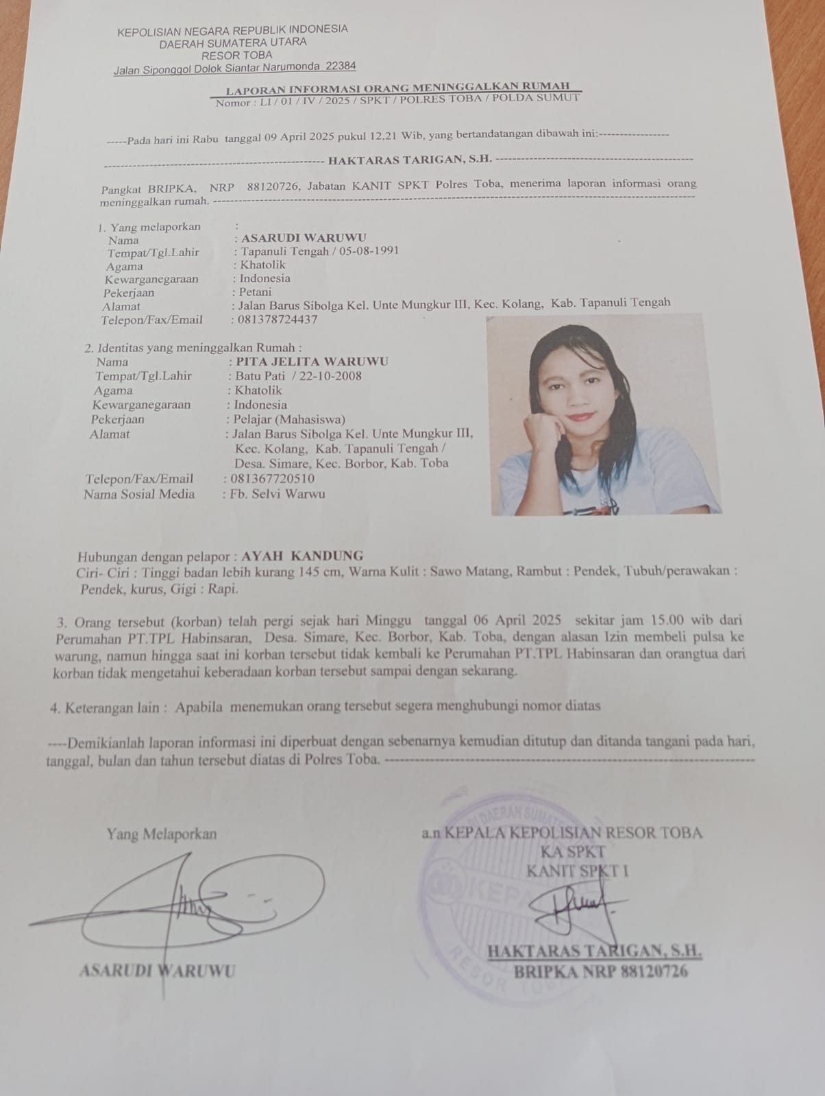 Cakrawalanational News-Toba, Sumatra Utara, Kabar mengejutkan datang dari Kabupaten Toba, Sumatra Utara. Seorang putri asal Kabupaten Tapanuli Tengah berinisial Pita Jelita Waruwu (17) dilaporkan hilang pada Minggu, (06/4/2025), pukul 15.00 WIB.