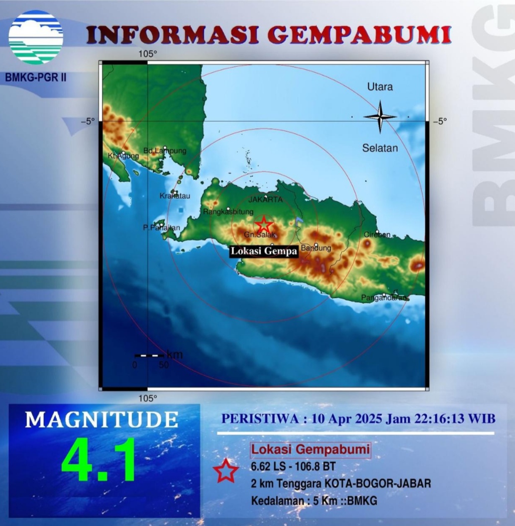 Cakrawalanational News-Bogor, Gempa bumi tektonik dengan kekuatan 4,1 magnitude mengguncang wilayah Kota Bogor, Jawa Barat dan sekitarnya pada hari Kamis, 10 April 2025, pukul 16:32:57 WIB. Meskipun getaran gempa tidak dirasakan oleh sebagian besar warga, Badan Meteorologi, Klimatologi, dan Geofisika (BMKG) telah mengeluarkan analisis dan himbauan kepada masyarakat.