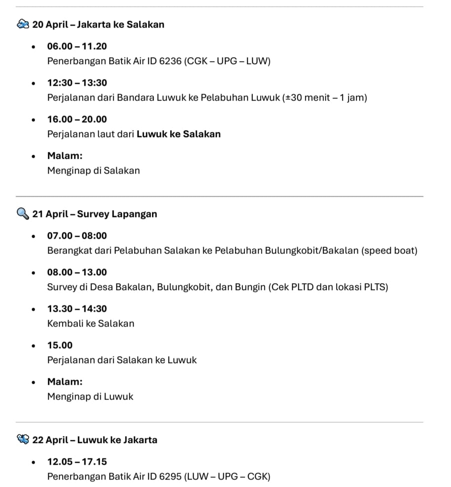 Rencananya Tim akan berkunjung ke lapangan pada hari Minggu 20 april 2025 dari jakarta menuju Luwuk Banggai dengan Batik air dan bermalam di Salakan.