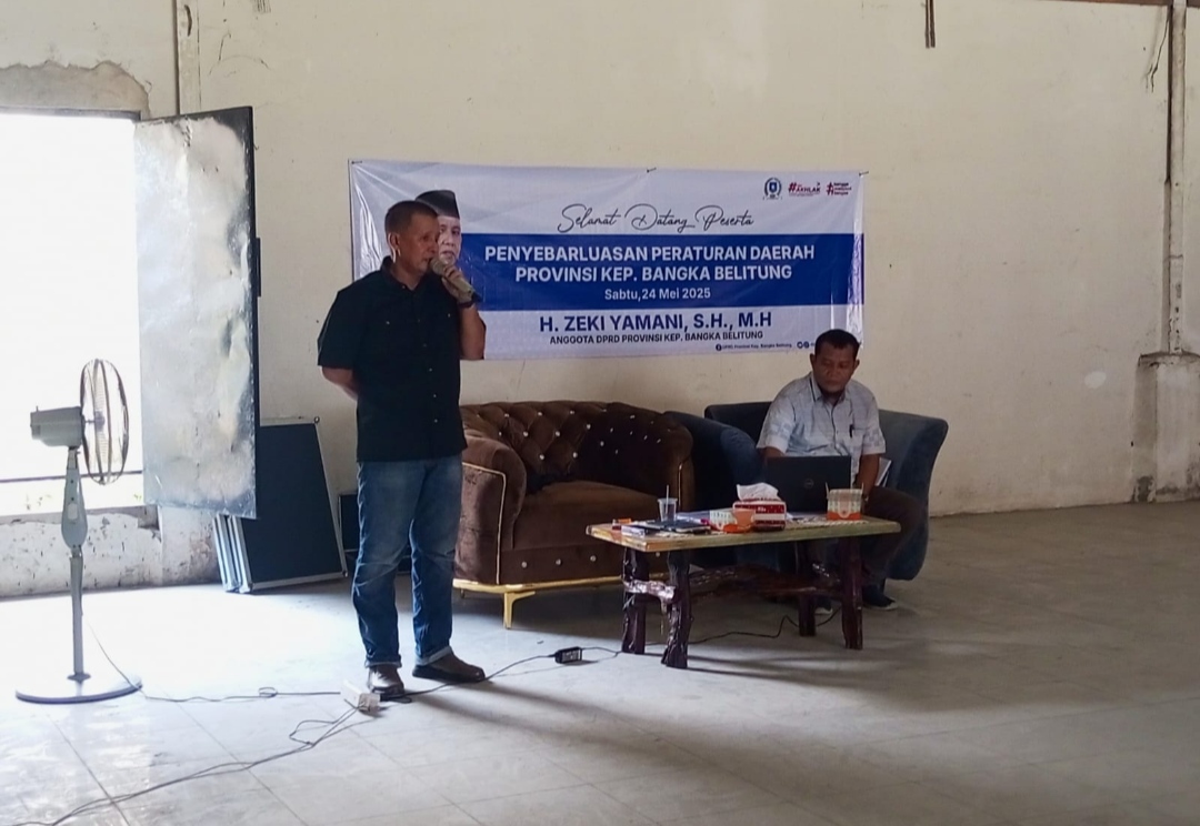 Cakrawalanational.news-Pangkalanbaru, Anggota DPRD Provinsi Kepulauan Bangka Belitung, Zeki Yamani, menggelar kegiatan penyebarluasan Peraturan Daerah (Perda) Nomor 07 Tahun 2014 tentang Pengelolaan Pertambangan Mineral di Gedung Eks Angel Wings, Jalan Raya Koba No. 28, Kelurahan Dul, Kecamatan Pangkalan Baru, Kabupaten Bangka Tengah.