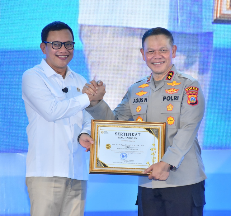 Cakrawalanational.news–Palu, Kapolda Sulawesi Tengah Irjen Pol Dr. Agus Nugroho menerima penghargaan atas komitmennya dalam pencegahan dan pemberantasan sindikasi Tindak Pidana Perdagangan Orang (TPPO) dan Penempatan Pekerja Migran Indonesia Ilegal.