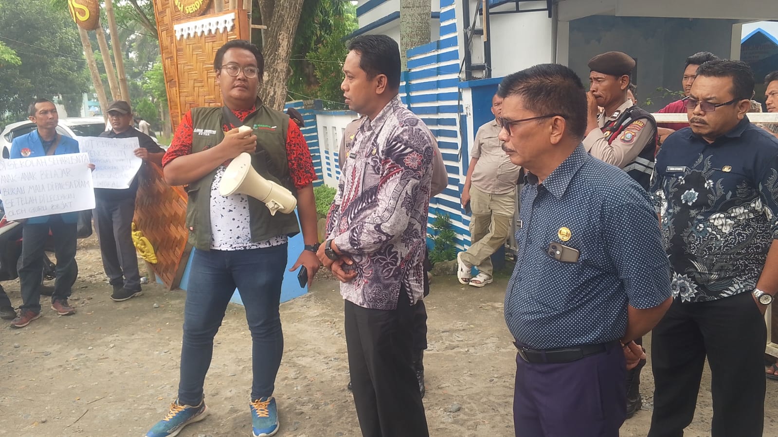 Spanduk dan poster bernada kecaman terhadap pihak sekolah dan Dinas Pendidikan mewarnai aksi tersebut.