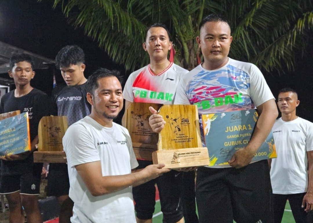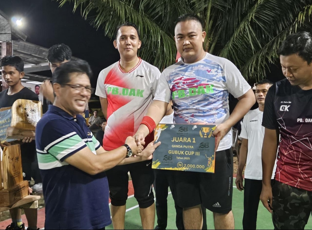 Cakrawalanational.news-Sungailiat, Sebanyak puluhan pasangan atlet Bulutangkis ganda putra yang bertanding pada kejuaraan Gubuk Cup Selasa malam, 24 Juni 2025 berakhir dilapangan Bulutangkis yang berlokasi di depan Rumah Zamzami seorang tokoh Pemuda Desa Air Anyer Kabupaten Bangka, Kepulauan Bangka Belitung, sekaligus menjadi sponsor kejuaraan tersebut.