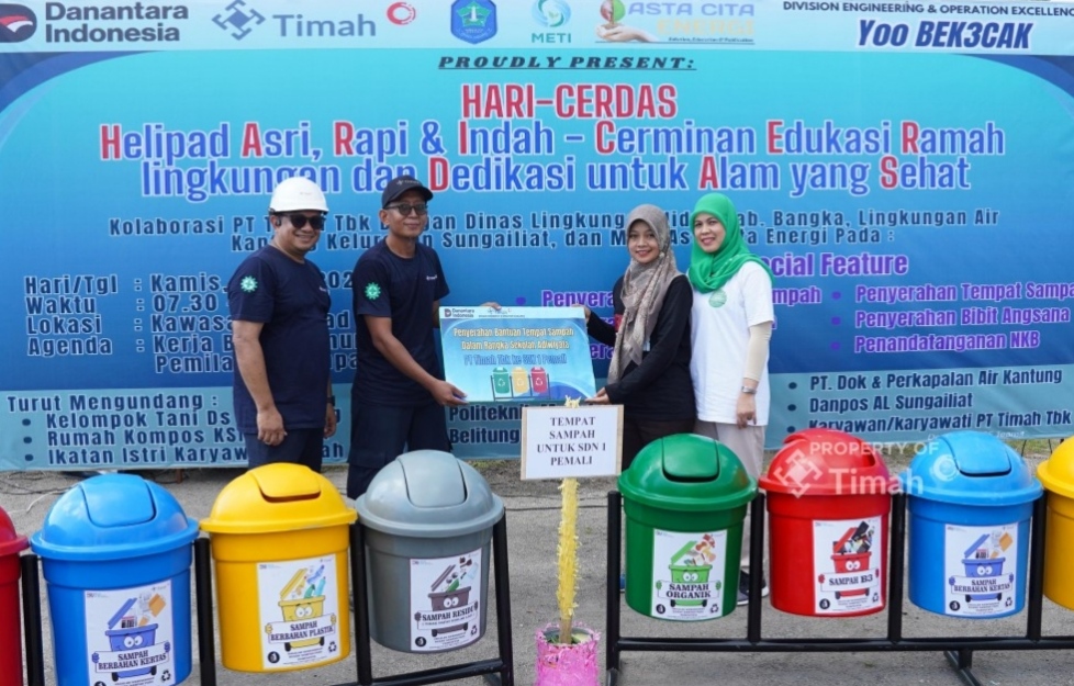 Cakrawalanational.news-Pangkalpinang, PT Timah menunjukkan kepedulian terhadap lingkungan dengan memberikan bantuan lima set tong sampah terpilah kepada SDN 1 Pemali, Kabupaten Bangka, Kepulauan Bangka Belitung (Babel).