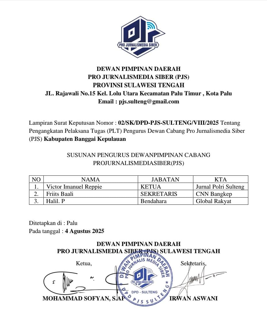 Berdasarkan SK nomor 02/SK/DPD-PJS Sulteng/VIII/2025 tentang pengangkatan Pelaksana Tugas (PLT) Pengurus Dewan Pimpinan Cabang Pro JurnalisMedia Siber (PJS) Kabupaten Banggai Kepulauan.