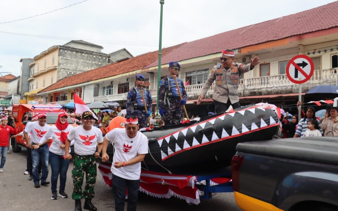 Cakrawalanational.news-Toboali, Aksi tarian Pacu Jalur mewarnai semarak Karnaval dalam rangka HUT Kemerdekaan ke 80 Republik Indonesia di Kabupaten Bangka Selatan (Basel) Kepulauan Bangka Belitung (Babel).