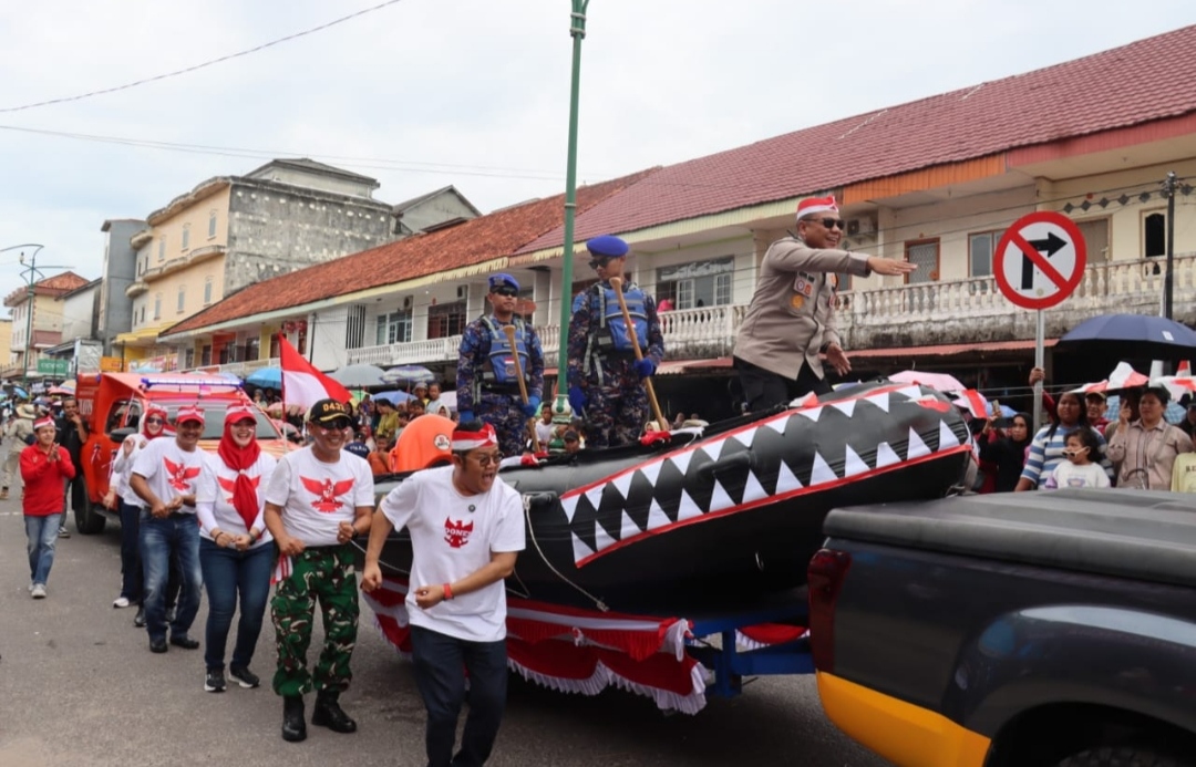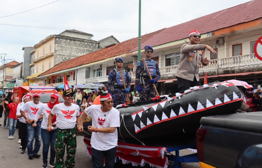 Selain menunjukkan aksi pacu jalur, Kapolres Basel juga terlihat membagikan bendera merah putih kepada masyarakat yang sedang menonton Karnaval tahunan ini.