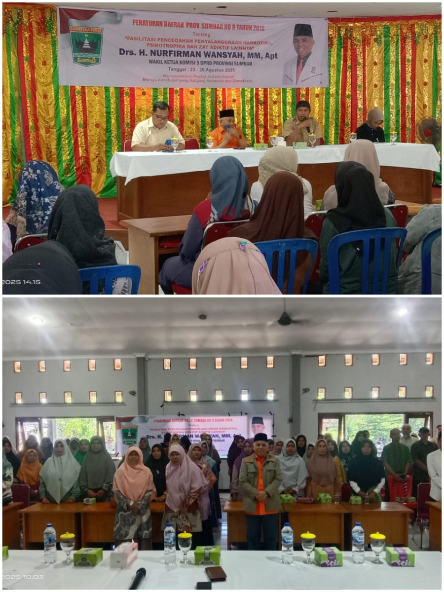 Cakrawalanational.news-Solok Selatan, Wakil Ketua Komisi V DPRD Provinsi Sumatera Barat, Drs. H. Nurfirman Wansyah, A.Pt. MM, menggelar sosialisasi Peraturan Daerah (Perda) Nomor 9 Tahun 2018 tentang Fasilitasi Pencegahan Penyalahgunaan Narkotika, Psikotropika, dan Zat Adiktif (NAPZA), Senin (25/8/2025). Kegiatan ini berlangsung di Wisma Umi Kalsum, Kecamatan Sungai Pagu, Kabupaten Solok Selatan.