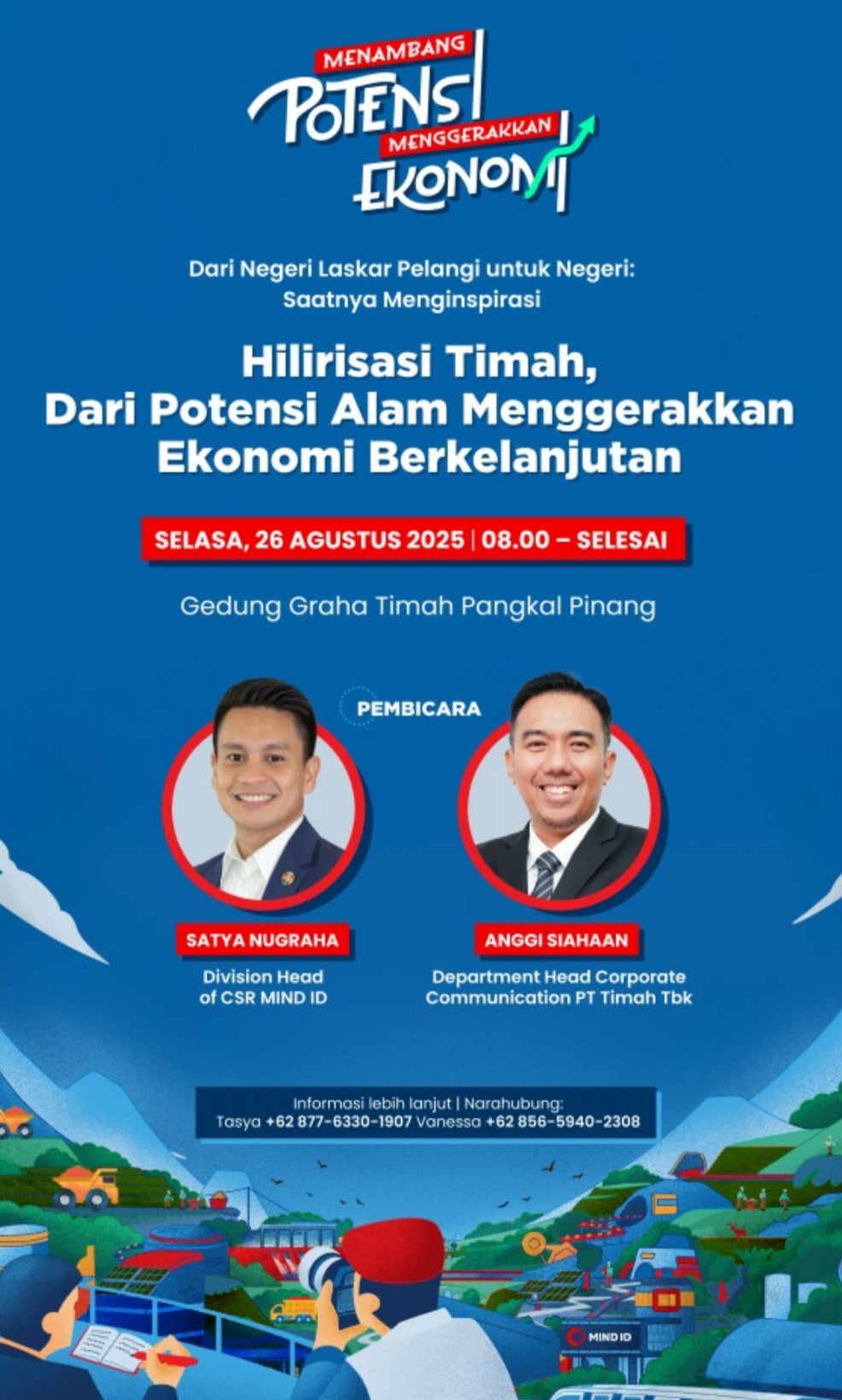 Cakrawalanational.news-Pangkalpinang, Indonesia Mining Industry Holding MIND ID bersama dengan PT Timah Tbk akan menggelar acara sosialisasi MediaMIND dengan tema “Potensi Pertambangan, Menggerakkan Ekonomi,” yang akan berlangsung di Provinsi Kepulauan Bangka Belitung (Babel), tepatnya di Graha Timah Pangkalpinang, pada Selasa, 26 Agustus 2025.