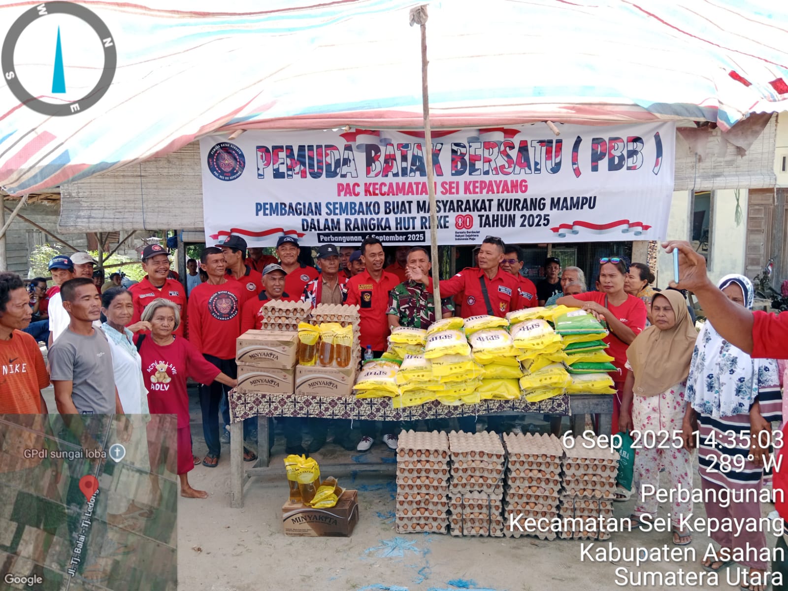 Cakrawalanational.news-Asahan, DPC PBB (Pemuda Batak Bersatu) Kabupaten Asahan bersama PAC Pemuda Batak Bersatu Kecamatan Sei Kepayang melaksanakan kegiatan berbagi sembako gratis kepada masyarakat kurang mampu di Desa Perbangunan, Kecamatan Sei Kepayang, Kabupaten Asahan, pada, Sabtu (6/9/2025).