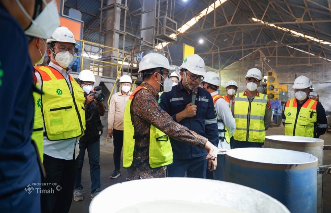 Didampingi Direktur Utama PT Timah Restu Widiyantoro dan Direktur Pengembangan Usaha PT Timah Suhendra Yusuf Ratuprawiranegara melihat langsung proses pemisahan mineral ikutan timah yang dilaksanakan di Amang Plant dan RE(OH) Tanjung Ular.
