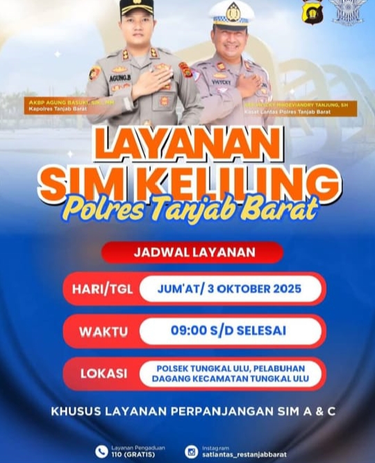 Cakrawalanational.news-Tanjung Jabung Barat, Polres Tanjung Jabung Barat melalui Satuan Lalu Lintas (Satlantas) melaksanakan kegiatan Pelayanan SIM Keliling bagi masyarakat, Jumat, (03/10/2025), sekitar pukul 09.00 WIB. Kegiatan tersebut dipusatkan di halaman Polsek Tungkal Ulu, Kabupaten Tanjung Jabung Barat, Provinsi Jambi.