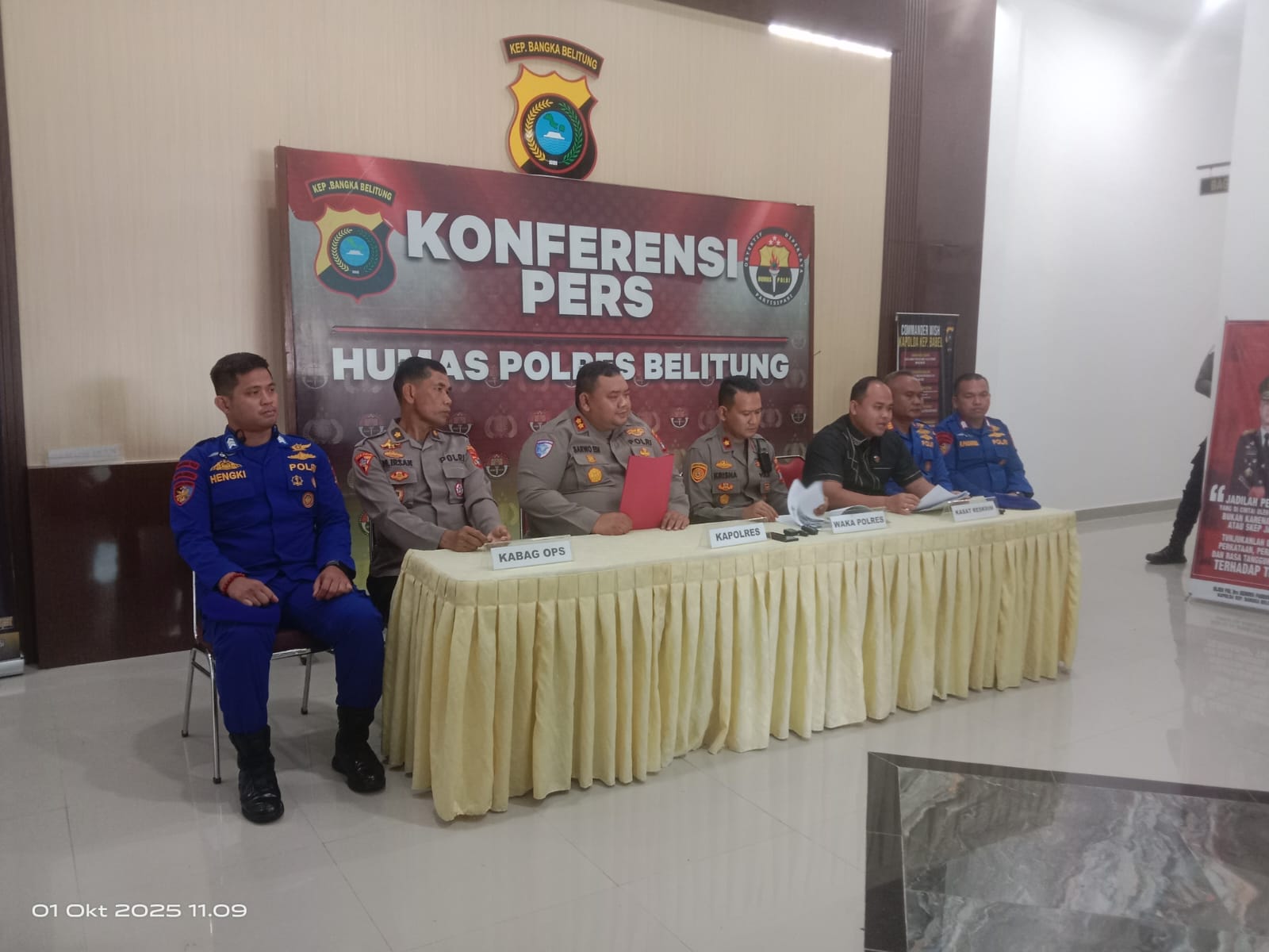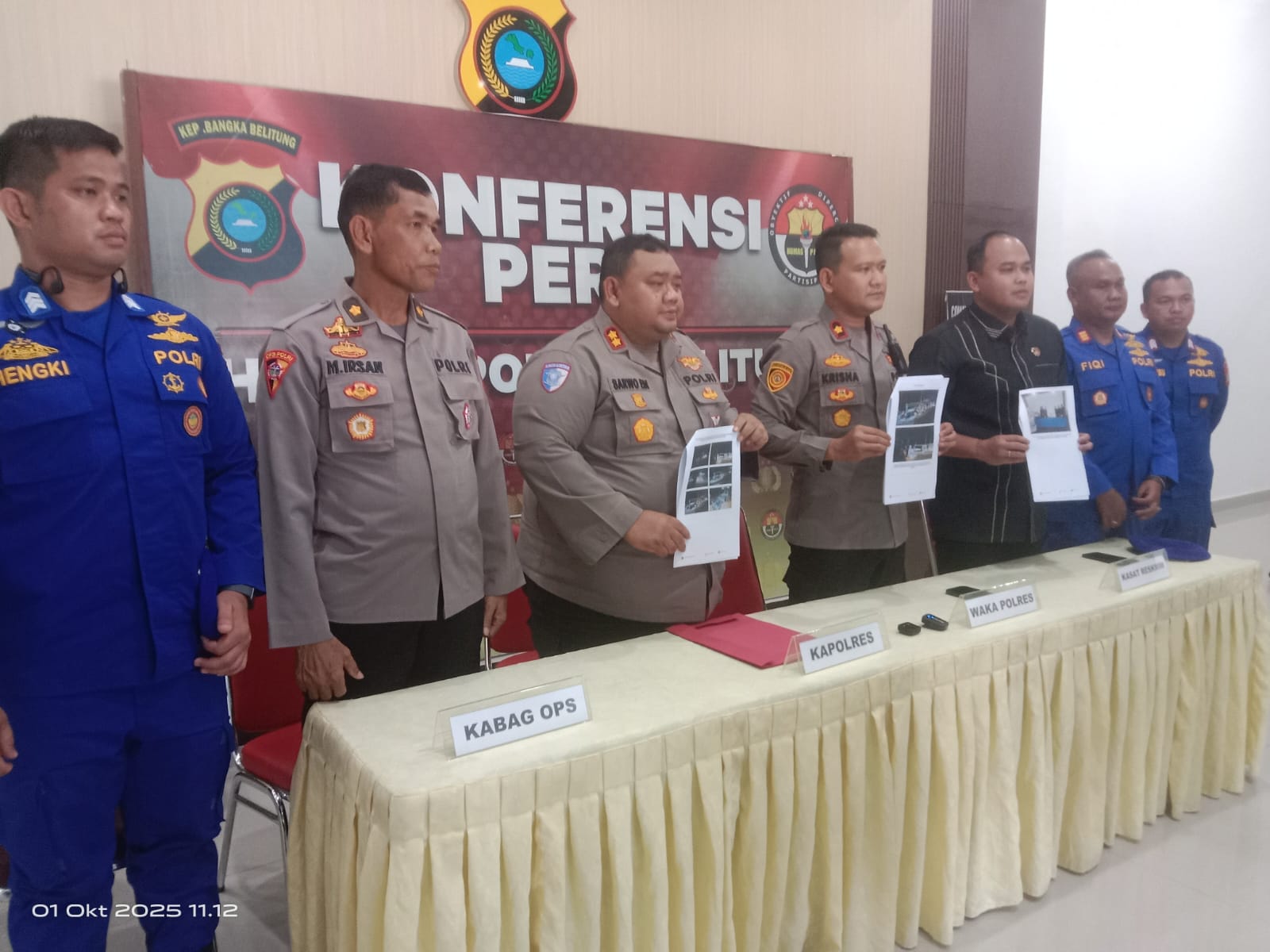 Press release digelar di Mako Polres Belitung. Dipimpin langsung oleh Kapolres Belitung AKBP Sarwo Edi Wibowo, S.I.K., didampingi Wakapolres Belitung Kompol Bagus Krisna Ekaputra, S.I.K., Kabag Ops Polres Belitung Kompol Maulup Irsan, S.I.P., Kasat Reskrim Polres Belitung AKP I Made Yudha Suwikarma, S.TrK.,S.I.K.,M.SI., Kasat Polairud Polres Belitung AKP Muhamad Hoesaien Muafiqi, S.H.,