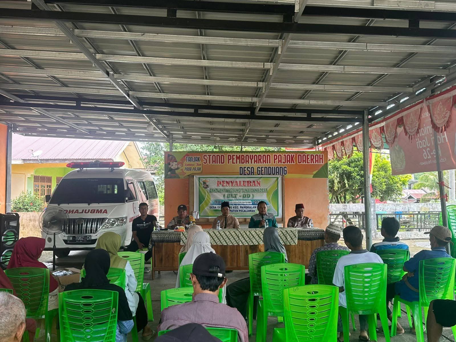 Kegiatan penyaluran BLT Dana Desa berlangsung pada Jumat, 17 Oktober 2025, bertempat di Aula Kantor Desa Genduang. Penyerahan dilakukan secara simbolis oleh Kepala Desa Genduang Syafri Julianto, SH, didampingi Pendamping Dana Desa Kecamatan Pangkalan Lesung, Bhabinkamtibmas, serta Kasi Kesejahteraan Desa Genduang Hamri Yanto, S.I.Kom.
