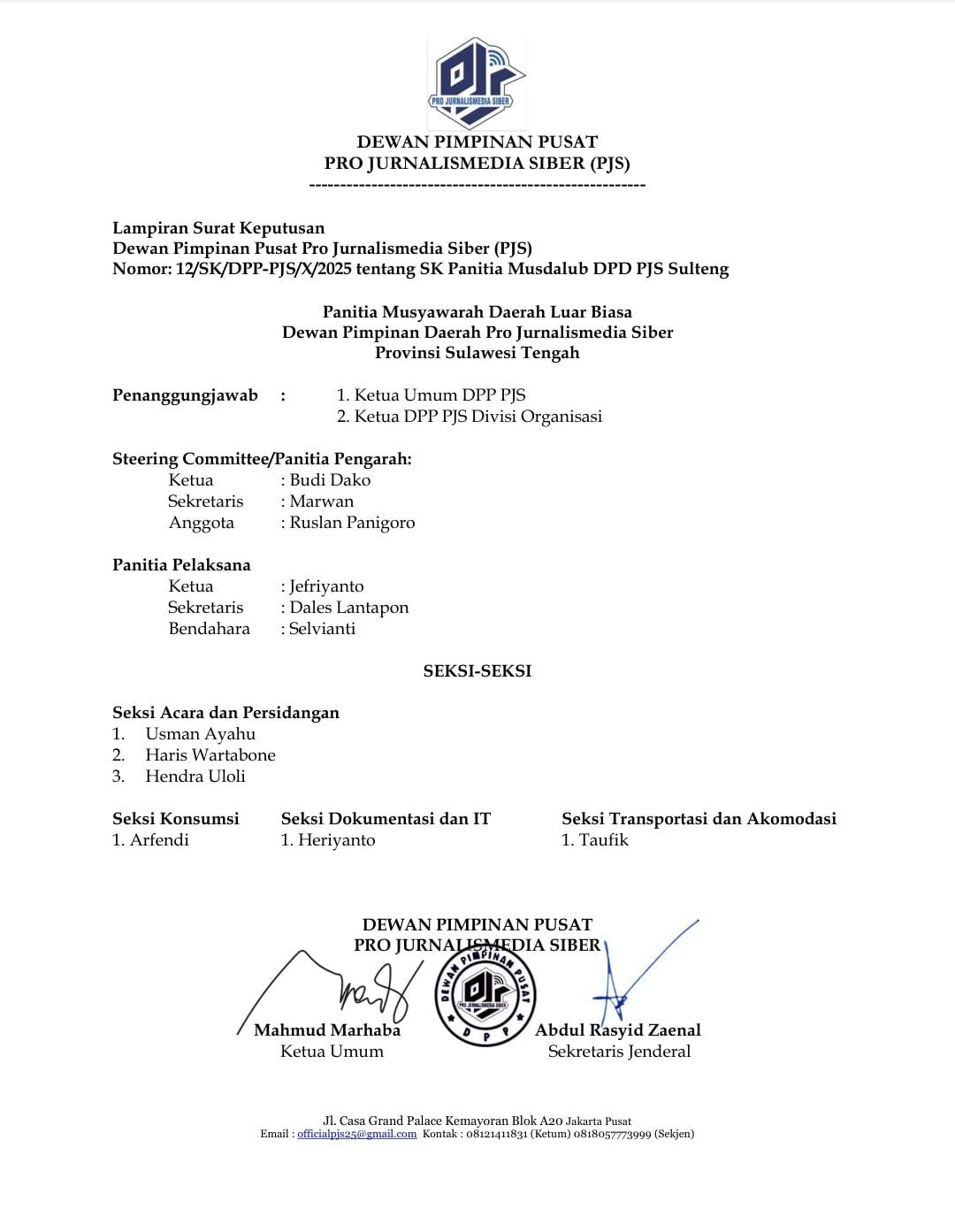 Cakrawalanational.news-Jakarta, Dewan Pimpinan Pusat Pro Jurnalismedia Siber (PJS) resmi menetapkan susunan Panitia Pelaksana Musyawarah Daerah Luar Biasa (Musdalub) Dewan Pimpinan Daerah (DPD) PJS Provinsi Sulawesi Tengah. Keputusan ini diambil berdasarkan hasil Rapat Pleno DPP PJS tanggal 7 Oktober 2025, sekaligus tindak lanjut dari pembekuan dan pengambilalihan kepengurusan DPD PJS Sulteng sebelumnya.