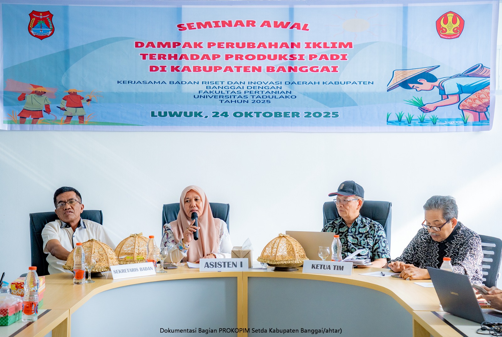 Cakrawalanational.news -Luwuk, Asisten Pemerintahan dan Kesra Setda Kabupaten Banggai, Hj. Nurdjalal, S.H, secara resmi membuka acara Seminar Awal Dampak Perubahan Iklim Terhadap Produksi Padi di Kabupaten Banggai, Jumat (24/10) sore di Ruang Rapat Kantor BRIDA Kabupaten Banggai Provinsi Sulawesi Tengah. Kegiatan ini adalah hasil kerjasama Badan dan Inovasi Daerah Kabupaten Banggai dengan Universitas Tadulako.