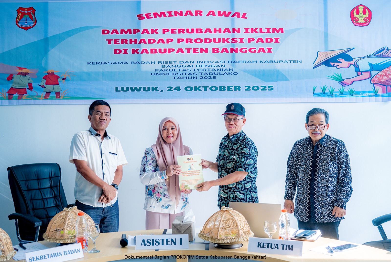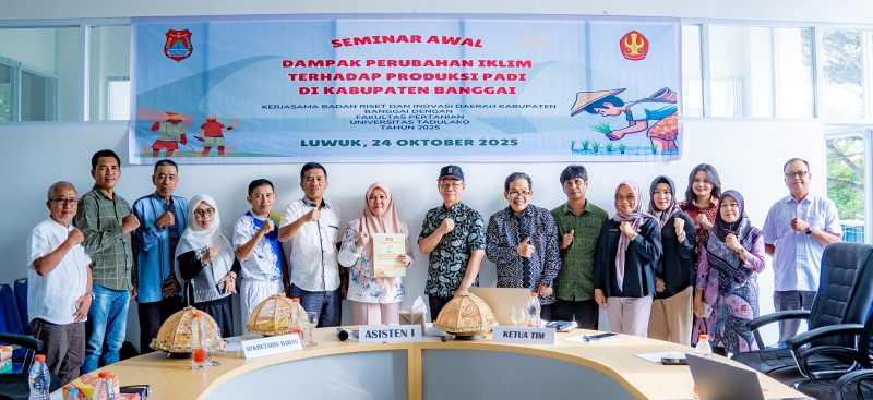 Pada kesempatan tersebut, Ketua Tim Pelaksana Riset Prof. Effendy menyerahkan dokumen Proposal Riset Dampak Perubahan Iklim Terhadap Produksi Padi di Kabupaten Banggai, kerjasama Badan Riset dan Inovasi Daerah Kabupaten Banggai dengan Fakultas Pertanian Universitas Tadulako Tahun 2025, yang diterima langsung oleh Asisten 1 Setda Kabupaten banggai, Hj. Nurdjalal.