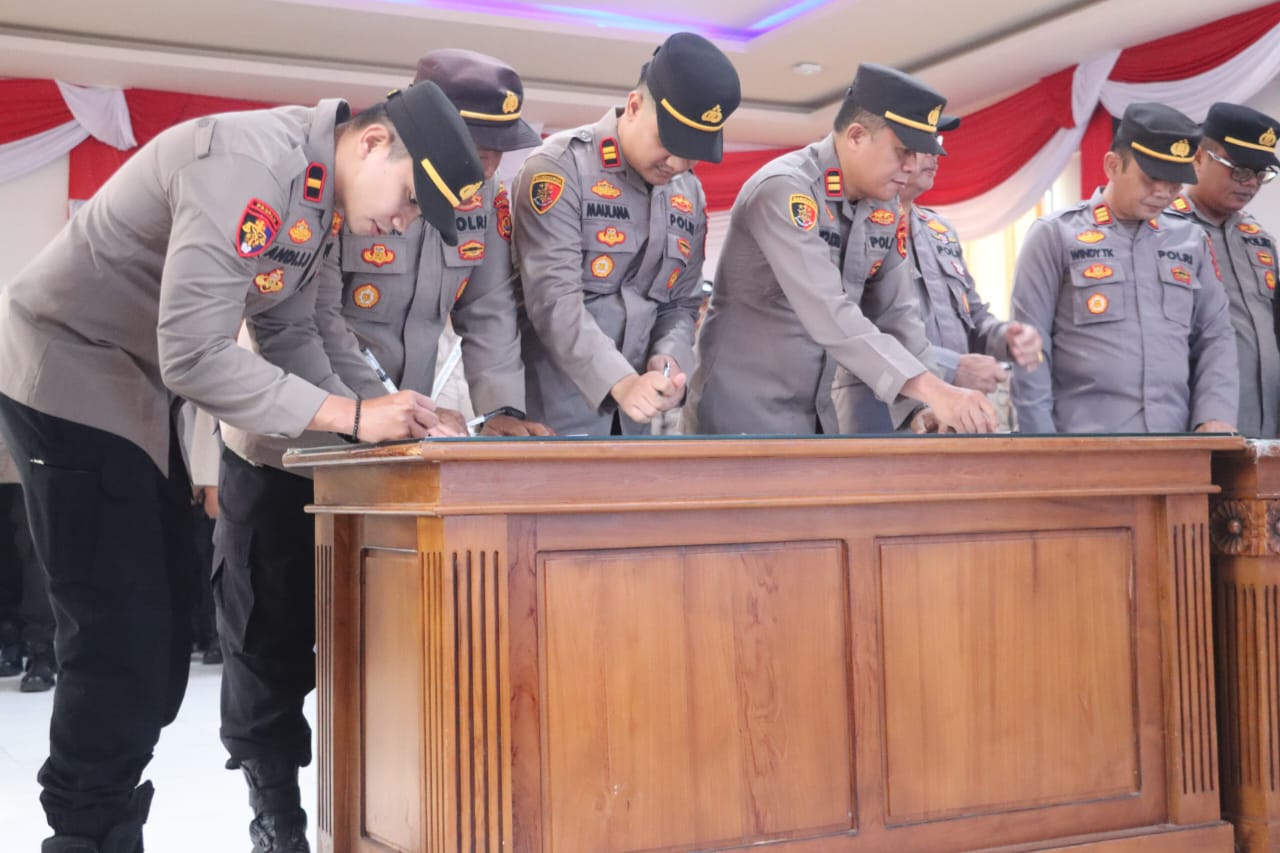 Penandatanganan komitmen berlangsung di Aula Rekonfu Mapolres, terhubung melalui Zoom Meeting. Kegiatan ini dipimpin oleh Plt. Kabag Sumber Daya Manusia (Sumda), AKP Gubril, S.H.