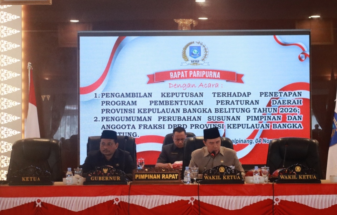 Cakrawalanational.news-Pangkalpinang, 4 November 2025 – Penjabat Sekretaris Daerah (Pj Sekda) Provinsi Kepulauan Bangka Belitung (Babel), Fery Afrianto, mewakili Gubernur Babel Hidayat Arsani, menghadiri Rapat Paripurna Penetapan Program Pembentukan Peraturan Daerah (Propemperda) Tahun 2026 sekaligus Rapat Paripurna Penetapan Perubahan Susunan Pimpinan dan Anggota Fraksi DPRD Provinsi Babel.