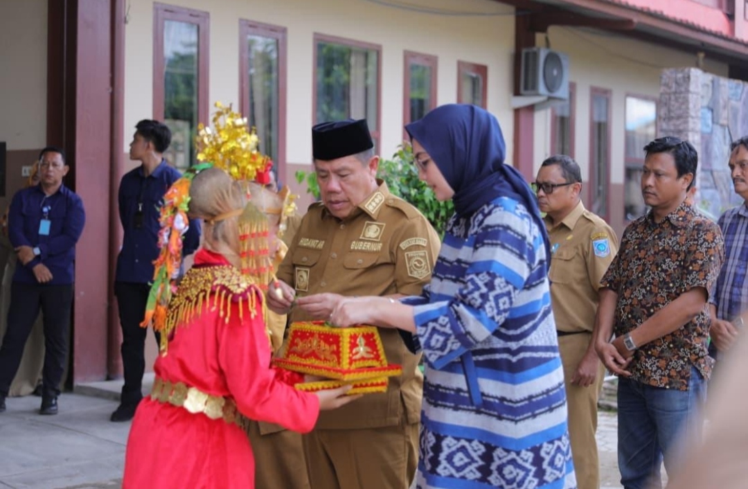 Setibanya, di halaman SMAN 1 Mentok, Gubernur Hidayat beserta rombongan, langsung disuguhi dengan Tari Sambut dari perwakilan peserta didik SMAN 1 Muntok beserta Kepala Sekolah dan para guru.