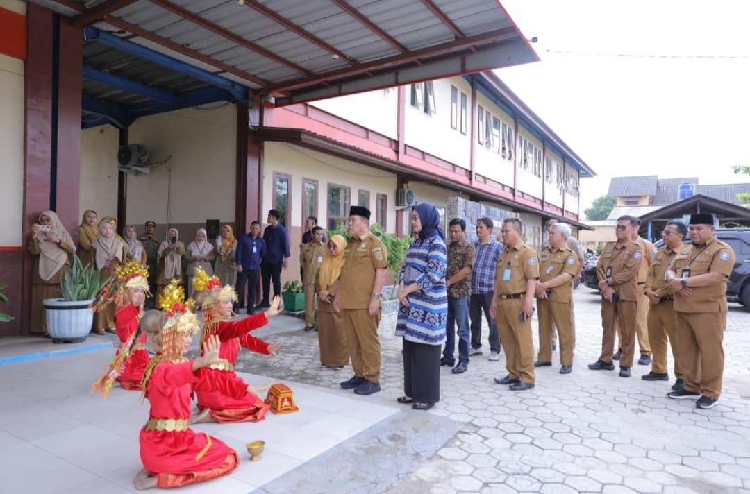 Setibanya, di halaman SMAN 1 Mentok, Gubernur Hidayat beserta rombongan, langsung disuguhi dengan Tari Sambut dari perwakilan peserta didik SMAN 1 Muntok beserta Kepala Sekolah dan para guru.