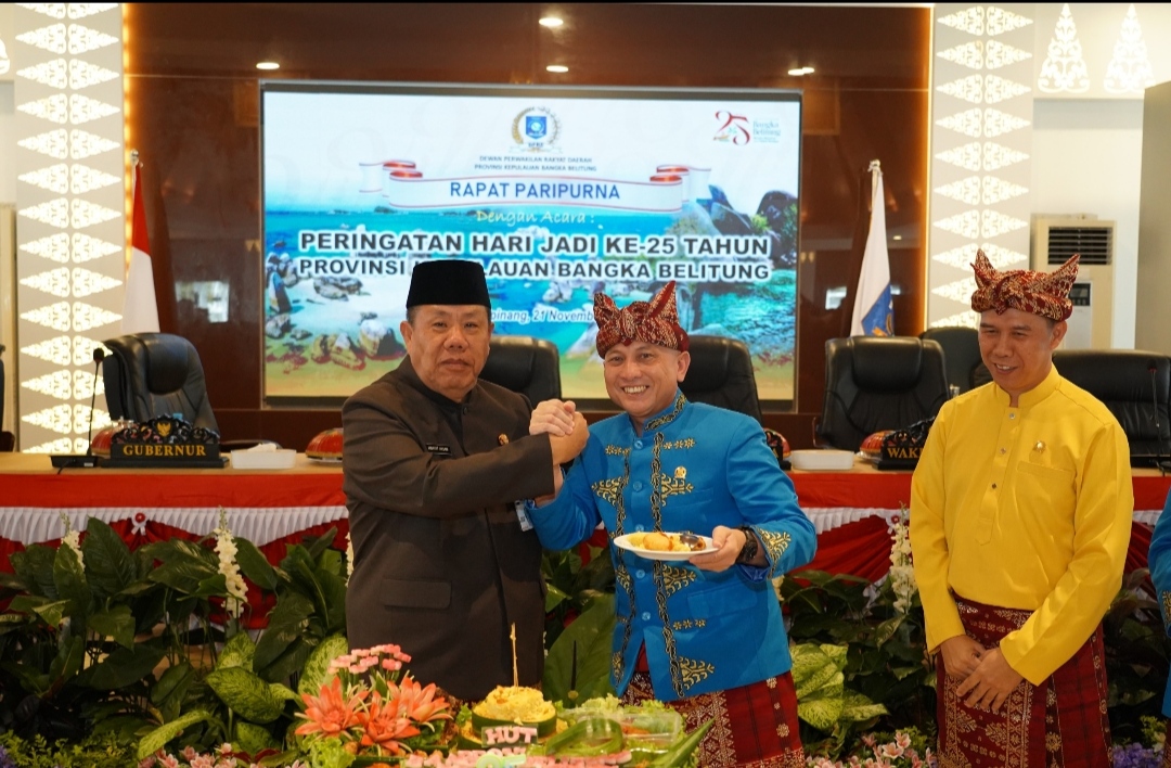 Cakrawalanational.news-Pangkalpinang, Pemerintah Provinsi Kepulauan Bangka Belitung (Pemprov Babel) memperingati Hari Jadi ke-25 dengan tema “Bersatu Bersama untuk Babel Berdaya“. Acara ini dibuka dengan Sidang Paripurna di Gedung Mahligai Rumah Dinas Gubernur, Air Itam Pangkalpinang, Jumat (21/11/2025).