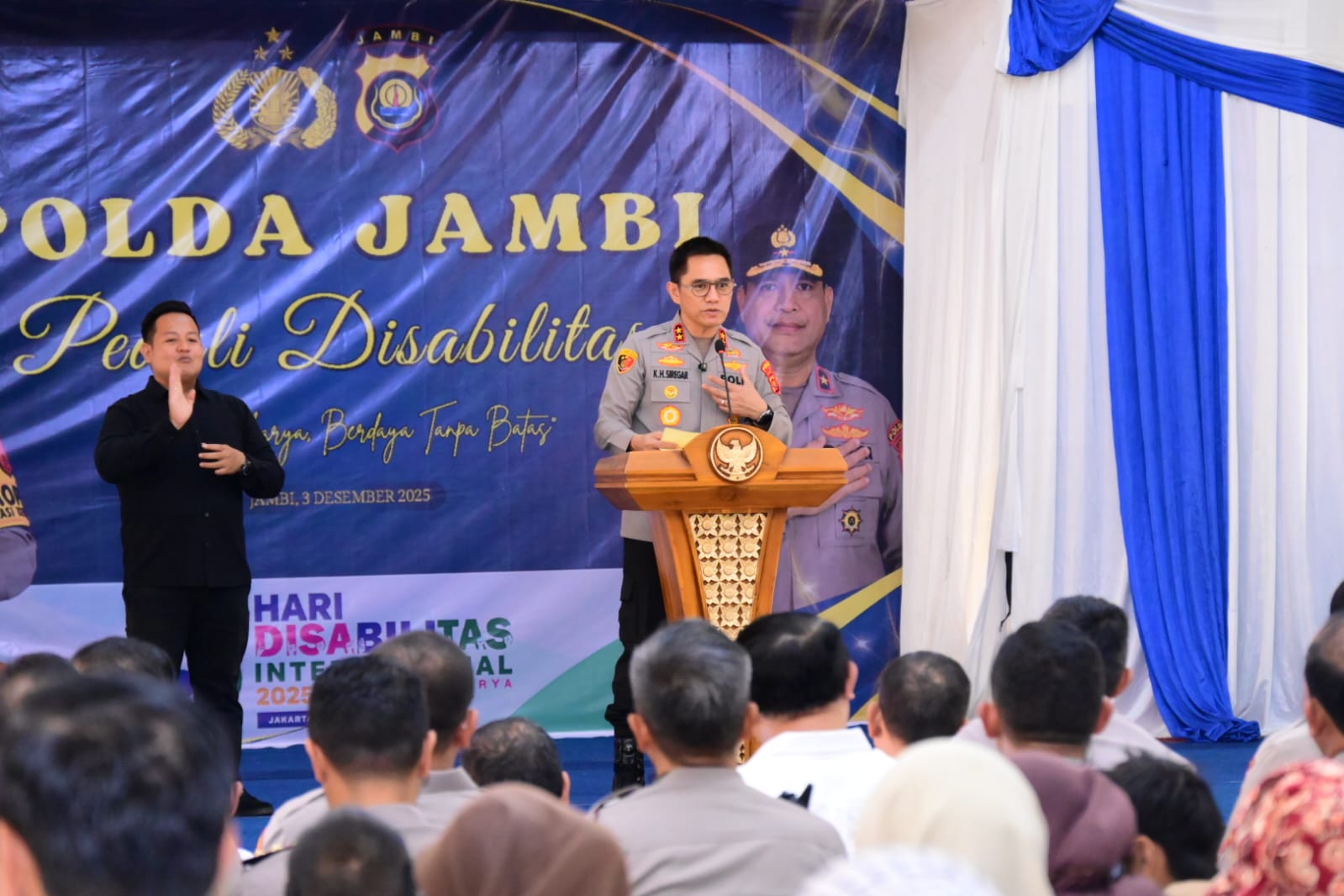 Pada kesempatan tersebut Kapolda Jambi juga memberikan sambutannya dan menegaskan komitmen Polri untuk terus hadir memberikan perlindungan dan pelayanan bagi seluruh masyarakat, termasuk penyandang disabilitas.