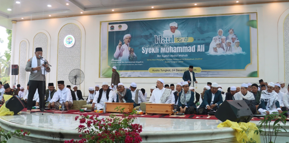 Cakrawalanational.news-Kuala Tungkal, Kapolres Tanjung Jabung Barat AKBP Agung Basuki, S.I.K., M.M., tampil sebagai figur sentral pada Puncak Haul Syekh Muhammad Ali bin Syekh Abdul Wahab ke-15 yang digelar di Pondok Pesantren Al Baqiyatush Shalihat, Kuala Tungkal Provinsi Jambi, Kamis (04/12/2025). Selain hadir sebagai unsur Forkopimda, Kapolres juga memegang peran penting sebagai Ketua Panitia Pelaksana, memastikan seluruh rangkaian acara berjalan aman, tertib, dan penuh kekhidmatan.